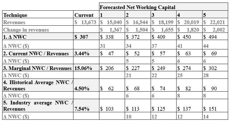 - Ignore the working capital history of the firm and base forecasted Δ NWC on the industry average non-cash working capital as a percent of revenues. This approach is most appropriate when historical NWC is volatile and unpredictable. It is also the best way of estimating non-cash working capital for very small firms that may see economies of scale as they grow.